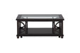 Eye-catching design is the hallmark of our Panama occasional collection. Each table features half-circle base detail and a tempered glass top insert. This cocktail table has a shelf for open storage or display and casters.