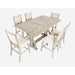 Stand out with the Fairview Dining Collection. The table is the show stopper with beautiful open work scrolling detail and a stunning chevron table top design. This set includes the counter-height table with light distressing and an extension leaf and six upholstered stools.